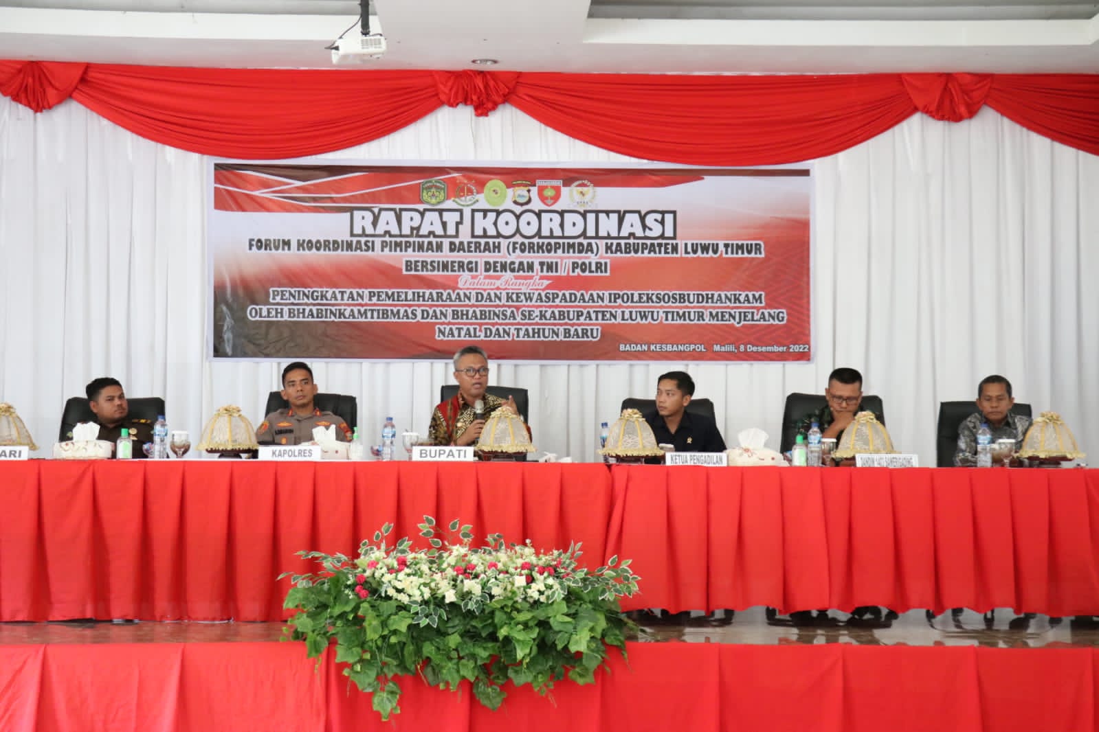 REPUBLIKNEWS.CO.ID, LUWU TIMUR- Bupati Luwu Timur, Budiman didampingi Kapolres Luwu Timur, AKBP Silvester M.M Simamora membuka Rapat Koordinasi (Rakor) Forum Koordinasi Pimpinan Daerah (Forkopimda) dalam rangka Peningkatan Pemeliharaan dan Kewaspadaan Ipoleksosbudhankam oleh Bhabinkamtibmas dan Bhabinsa se-Luwu Timur menjelang Natal dan Tahun Baru.