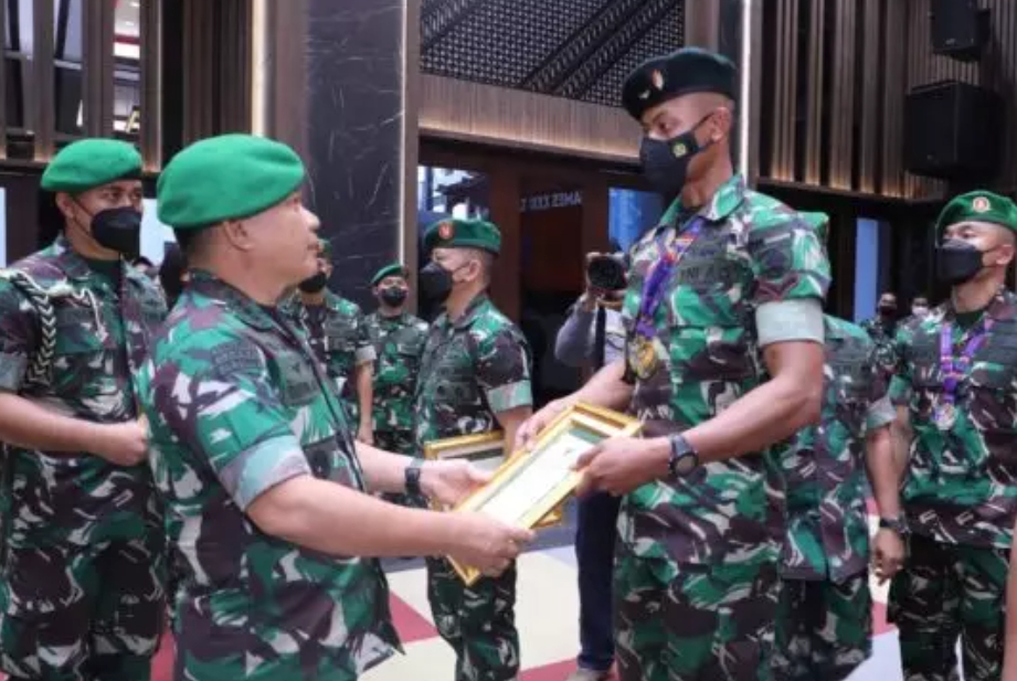 REPUBLIKNEWS.CO.ID, JAKARTA — Kepala Staf Angkatan Darat (Kasad) Jenderal TNI Dudung Abdurachman, memberikan penghargaan kepada 34 personel TNI AD yang turut berjuang mengharumkan nama bangsa diajang olahraga SEA Games ke-31 di Hanoi Vietnam. Acara penyerahan penghargaan dilaksanakan di Aula Djati Koesomo Mabesad Jakarta, Senin (30/05/2022).