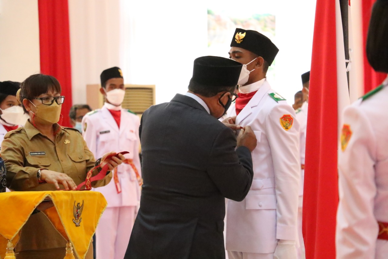 Wakil Gubernur melakukan prosesi pengukuhan dengan menyematkan Pin Merah Putih Garuda dan Kendit kepada salah satu perwakilan Paskibraka, yang kali ini diwakili oleh Mario Tafui, siswa asal SMA Dian Harapan Kupang.