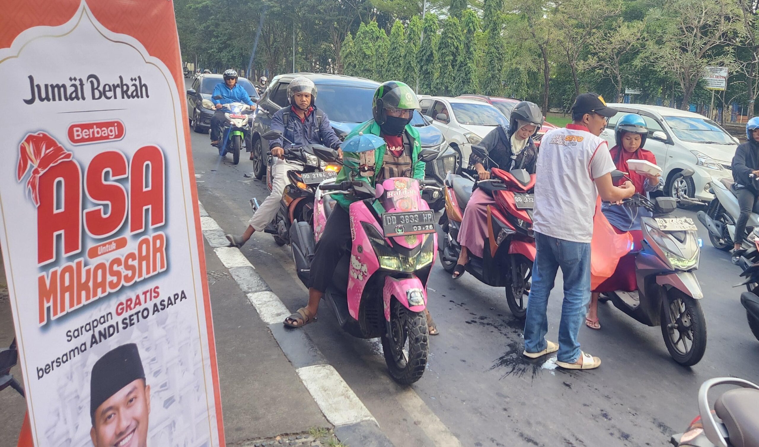 Kegiatan Jumat Berkah Nasi Kuning Gratis Bersama Andi Seto Asapa (ASA) ini berlangsung di sekitaran Fly Over, Jalan AP Pettarani, Makassar, Jumat (12/7/2024) pagi.