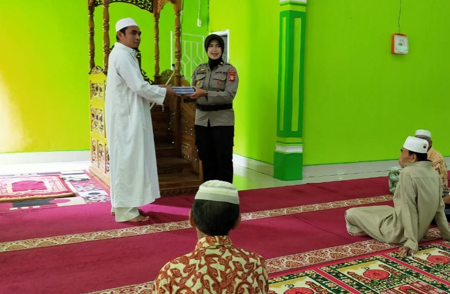 Usai menyampaikan imbauan di hadapan jamaah Jumat, Kapolsek memberikan bantuan Al-Qur’an yang diserahkan langsung kepada pengurus masjid Nurul Khalawatia. (Thamzil)