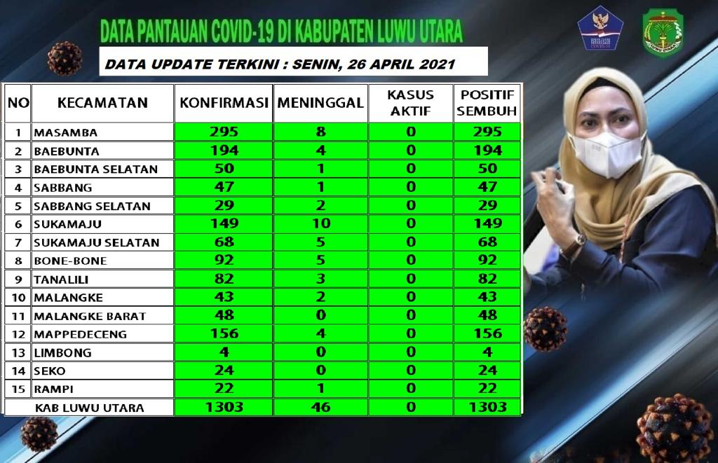 Sekadar diketahui, kasus COVID-19 di Luwu Utara sampai hari ini, Senin 26 April 2021, sudah mencapai 1.349 kasus, dengan rincian 1.303 sembuh dan 46 meninggal dunia.