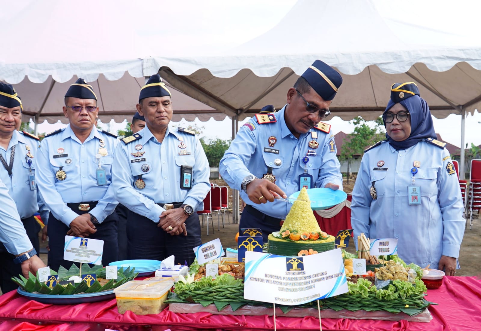 Hadir dalam pelaksanaan syukuran jajaran pimpinan tinggi pratama Kanwil Kemenkumham Sulsel, Kepala UPT, dan seluruh pegawai.