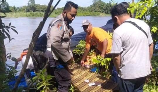 Anggota Polisi bersama warga melakukan evakuasi Jenazah yang Kapalnya tenggelam di Perairan Sungai Mahakam. (Istimewa)