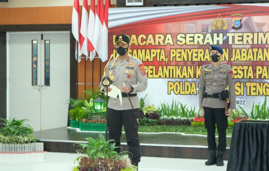 REPUBLIKNEWS.CO.ID, PALU — Kapolda Sulawesi Tengah (Sulteng) Irjen Pol Rudi Sufahriadi memimpin upacara serah terima jabatan Dirsamapta, penyerahan Jabatan Kapolres Palu serta pelantikan Kapolresta Palu dan Kepala SPKT, di Aula Rupatama Polda Sulteng, Selasa (19/04/2022).