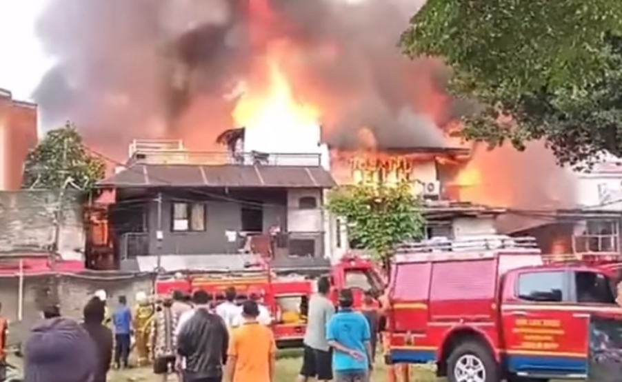 Tampak api membakar bangunan dengan hebat, bangunan itu juga letaknya tak jauh dari rumah-rumah penduduk.