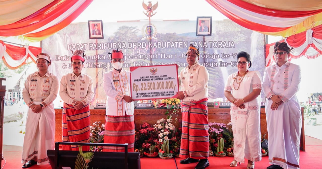 Bantuan keuangan itu diserahkan kepada Bupati Tana Toraja Theofilus Allorerung, pada Rapat Paripurna 65 tahun Kabupaten Tana Toraja yang dirangkaikan 775 Tahun Toraja di Bandara Pongtiku, Rabu (31/8/2022).