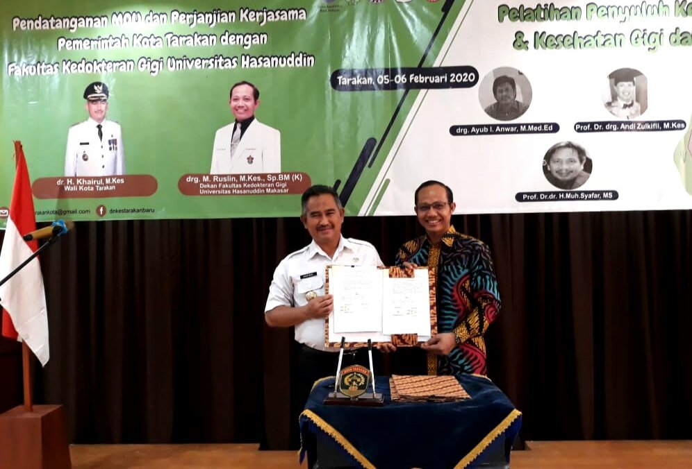 Penandatanganan kerjasama itu dilakukan Dekan FKG Unhas drg. Muhammad Ruslin, M.Kes., Ph.D., Sp.BM(K) dengan Wali Kota Tarakan dr. H. Khairul, M.Kes, di Kota Tarakan, Kamis (06/02/2020).