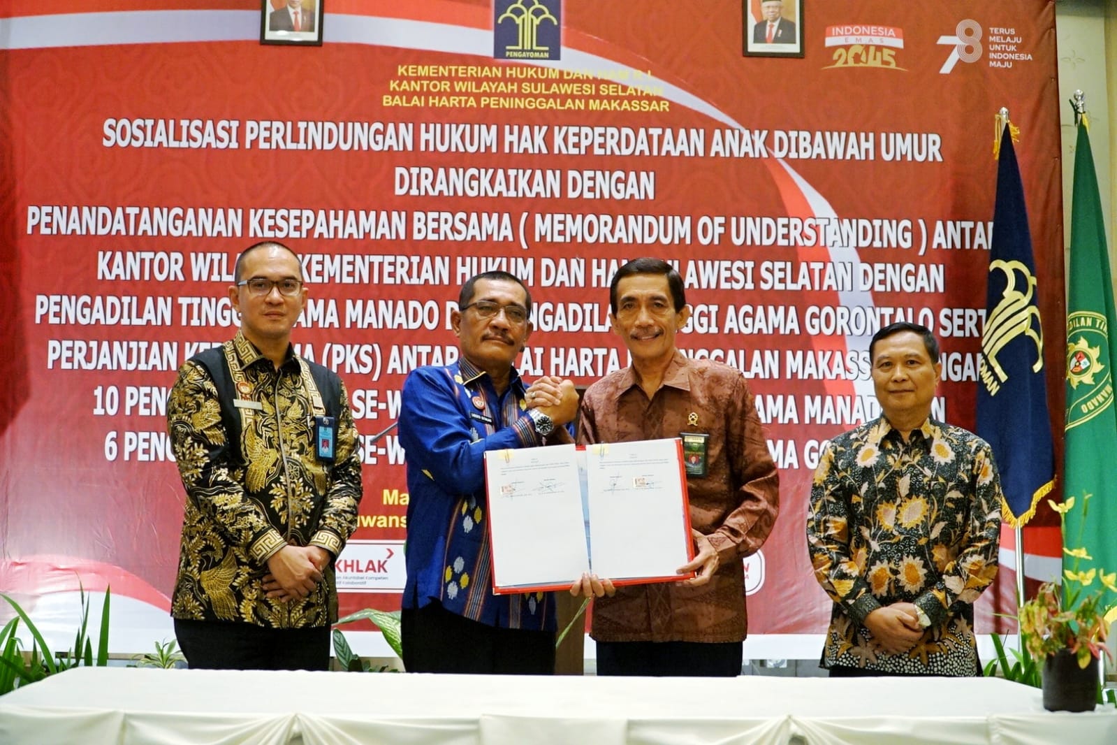 Kerjasama ini dituangkan dalam kesepakatan bersama yang ditandatangani antara Kakanwil Kemenkumham Sulsel Liberti Sitinjak dengan Ketua Pengadilan Tinggi Agama Manado, M. Nahiruddin dan Ketua Pengadilan Tinggi Agama Gorontalo, Abdullah yang disaksikan oleh Hakim Agung Mahkamah Agung Indonesia, Edi Riadi, di Hotel Luwansa Manado.