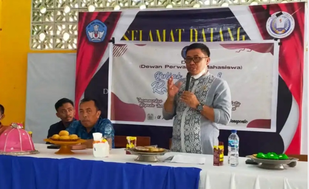 REPUBLIKNEWS.CO.ID, JENEPONTO — Ketua Komisi II DPRD Jeneponto Hanapi Sewang, memberikan materi kuliah umum di Kampus STIE STKIP YAPTI Turatea Jeneponto, Selasa (01/03/2022).