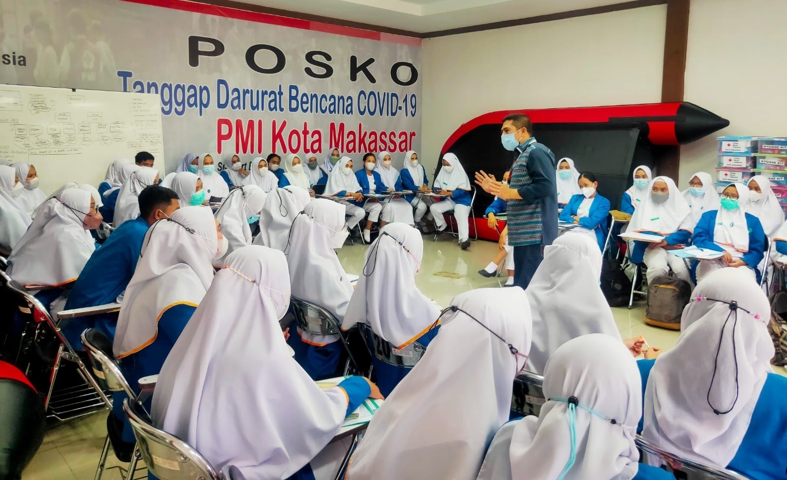 Dihadapan puluhan mahasiswa, Ketua PMI Makassar DR Syamsu Rizal MI, menyampaikan apresiasi karena telah menjadikan PMI Makassar sebagai salah satu tempat magang praktik manajemen bencana.