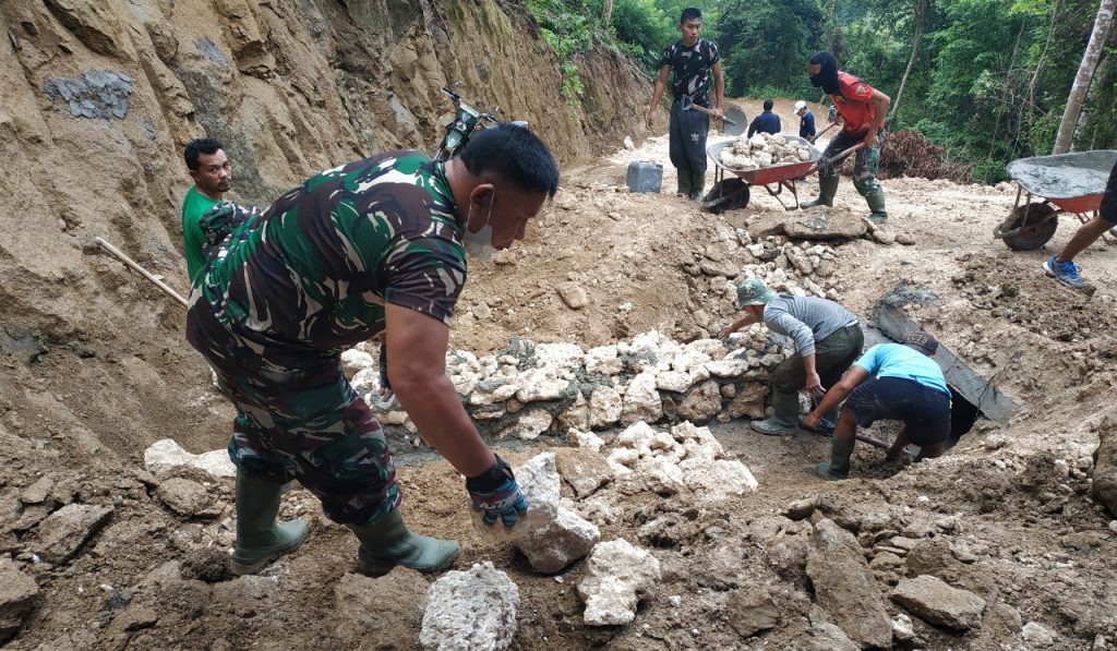 “Kami terpaksa harus bekerja ditengah guyuran hujan,” tutur Edy, Senin (12/07/2021) saat istirahat di Lokasi TMMD ke 111.