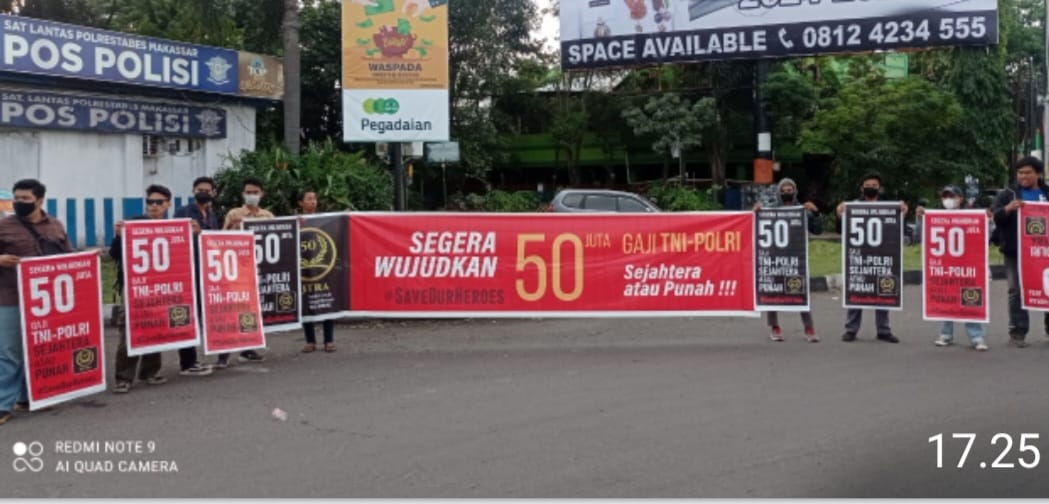 Puluhan peserta aksi di Pertigaan jalan Andi Pettarani dan Alauddin kota Makassar menggelar spanduk berisi tuntutan wujudkan 50 juta gaji TNI Polri dengan tagline Sejahtera atau Punah, berlangsung aman dan damai.