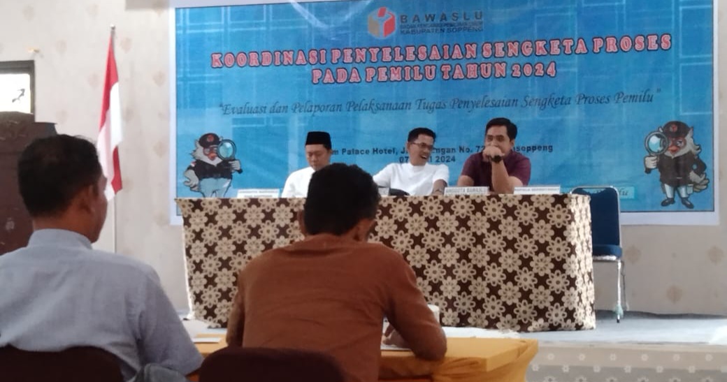 REPUBLIKNEWS.CO.ID, SOPPENG — Badan Pengawas Pemilu (Bawaslu) Kabupaten Soppeng menggelar Koordinasi Penyelesaian Sengketa proses pada Pemilu tahun 2024 di Aula Maryam Palace Watansoppeng, Minggu (07/04/2024).