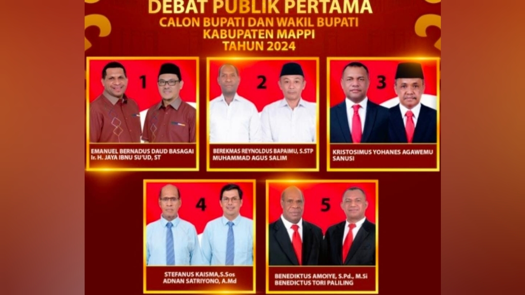 Dalam kontestasi Pilkada 2024 ada lima (5) pasangan calon Bupati dan Wakil Bupati Mappi yang bertarung, yakni adalah pasangan calon nomor urut 1 Emanuel B D Basagai- Jaya Ibnu Su’ud, pasangan calon nomor urut 2 Berekmas Reynoldus Bapaimu-Muhammad Agus Salim, pasangan calon nomor urut 3 Kristosimus Yohanes Agawemu-Sanusi, pasangan calon nomor urut 4 Stefanus Kaisma-Adnan Satriyono, dan pasangan calon nomor 5 Benediktus Amoiye-Benediktus Tori Paliling.