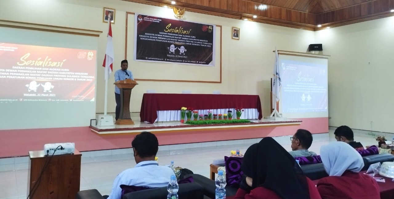 REPUBLIKNEWS.CO.ID, WAKATOBI — Komisi Pemilihan Umum (KPU) Kabupaten Wakatobi, Sulawesi tenggara, menggelar sosialisasi tentang Daerah Pemilihan dan Alokasi Kursi Anggota DPR, DPRD Provinsi dan DPRD Kabupaten/Kota dalam Pemilu 2024.