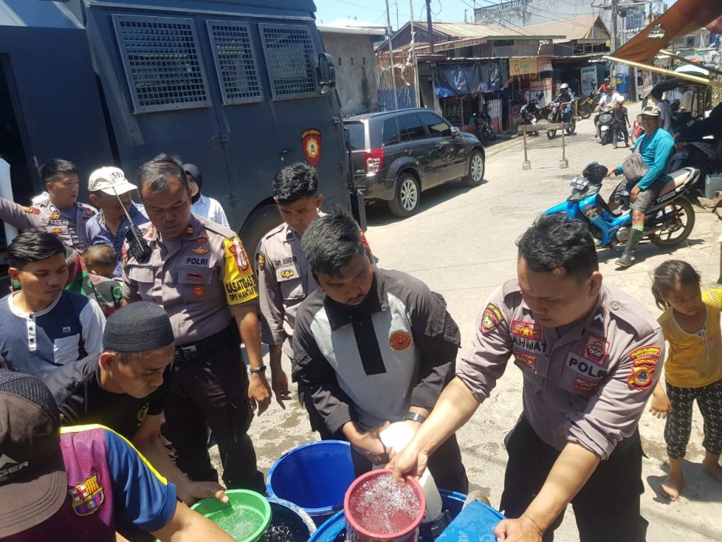 Kegiatan bagi-bagi Air Bersih ini dipimpin langsung oleh Kapolres Pelabuhan Makassar, AKBP Aris Bahtiar, SH, S.Ik., M.Si. dengan menggunakan Mobil AWC (Armor Water Canon) milik Polres Pelabuhan Makassar.