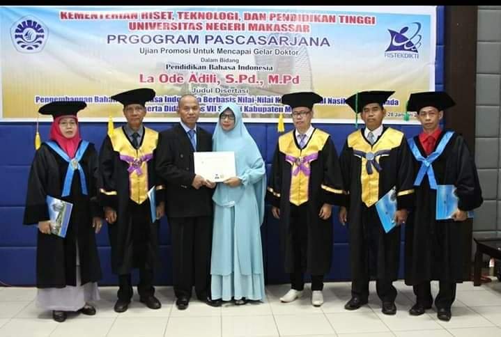 Dengan judul Desertasi “Pengembangan Bahan Ajar Bahasa Indonesia Berbasis Nila-Nilai Kearifan Lokal Nasihat Kotaba di Kabupaten Muna”, La Ode Adili S.pd., M.pd mendapatkan indeks presntasi kumulatif 3,97 dengan predikat sangat memuaskan.