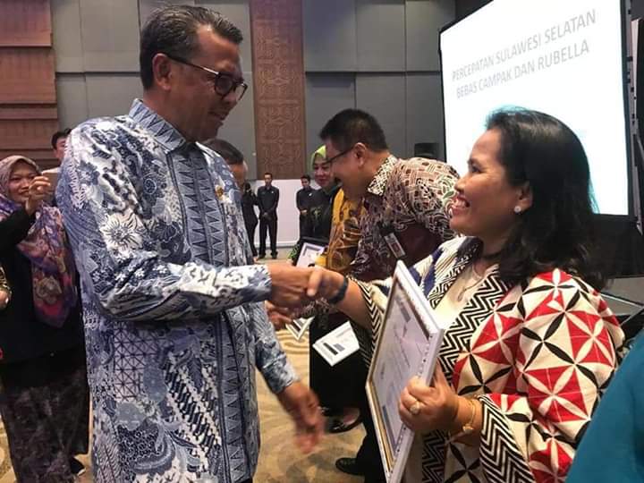 Penghargaan tersebut diterima langsung Kepala Dinas Kesehatan Kabupaten Pinrang, Dyah Puspita Dewi, pada Pertemuan Penguatan Imunisasi Rutin dan Percepatan Pencapaian Imunisasi Measles Rubella (MR) sekaligus Pencanangan Pekan Imunisasi MR Provinsi Sulsel di Hotel Four Point By Sheraton Makassar, Jumat (30/11/2018).