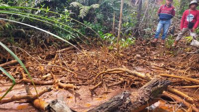 “Waktu teman-teman check sediment Pond, saya memilih mengecek lokasi pembuangan dan turun menelusuri, saya melihat ada anak sungai yang dipenuhi lumpur berwarna kemerahan yang tidak jauh dari sediment Pond kurang lebih 15 meter dan anak sungai ini mengalir langsung ke sungai Pongkeru sepanjang kurang lebih 5 Kilometer,” ungkap Alpian.