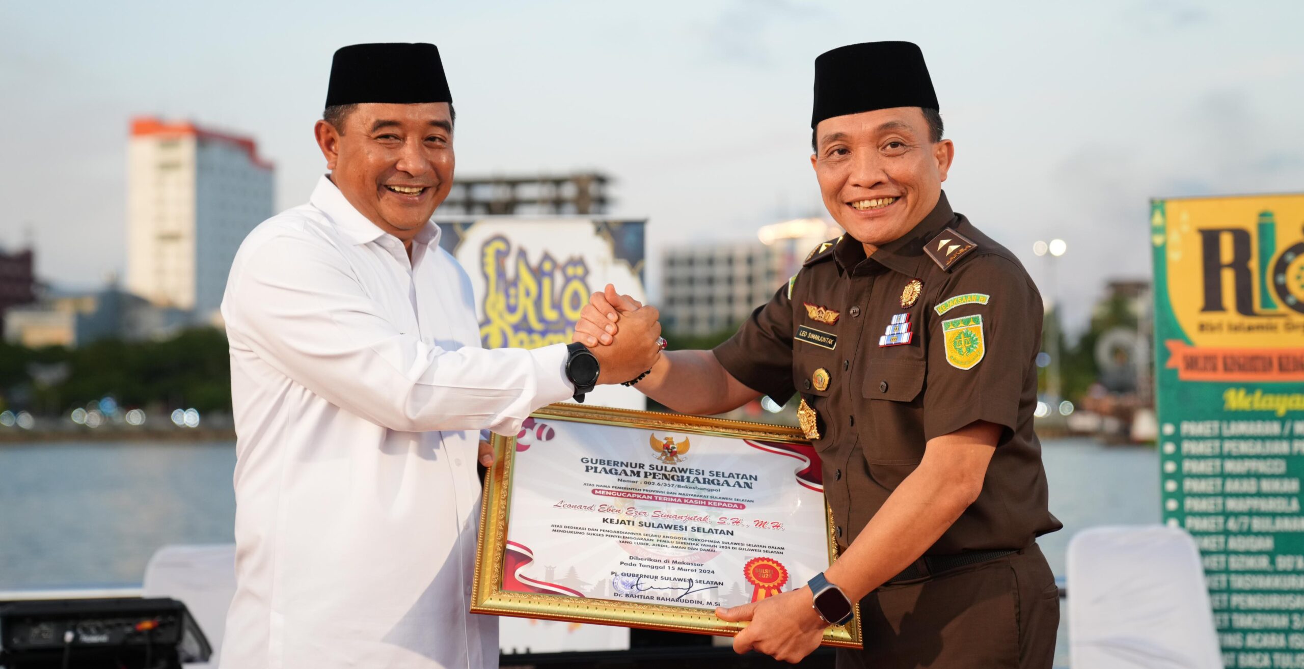 REPUBLIKNEWS.CO.ID, MAKASSAR — Penjabat Gubernur Sulawesi Selatan atas nama Pemerintah Provinsi Sulawesi Selatan memberikan piagam penghargaan kepada Leonard Eben Ezer Simanjuntak atas dedikasi dan pengabdiannya selaku anggota Forkopimda Sulawesi Selatan selama menjabat sebagai Kepala Kejaksaan Tinggi (Kajati).