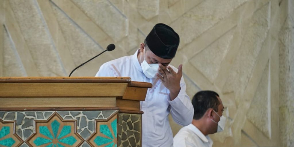 REPUBLIKNEWS.CO.ID, MAKASSAR — Plt Gubernur Sulsel Andi Sudirman Sulaiman, tak kuasa menahan kesedihan dan meneteskan air matanya saat sambutan sebelum Salat pelepasan jenasah Amarhum Ketua Majelis Ulama Indonesia (MUI) Sulawesi Selatan AGH Sanusi Baco, di Masjid Raya Makassar, Minggu (16/05/2021).