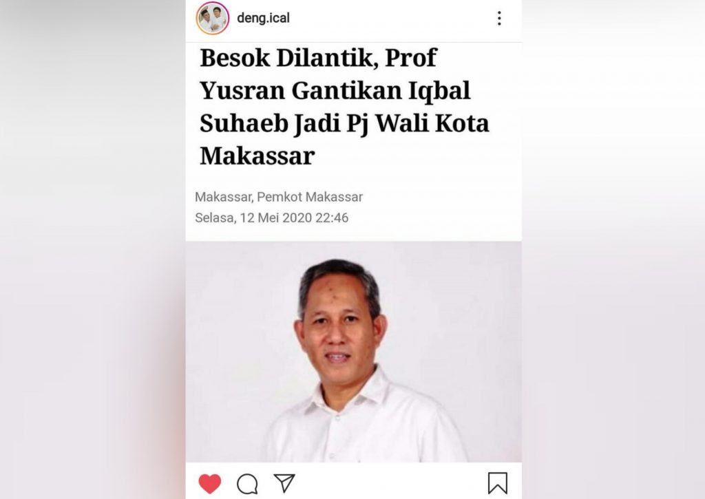 Ketua PMI Makassar Dr Syamsu Rizal Mi, melalui akun media sosial instagram pribadinya @deng.Ical, memposting sebuah berita dari salah satu media online yang berjudul “Besok Dilantik, Prof Yusran Gantikan Iqbal Suhaeb Jadi Pj Wali Kota Makassar”.