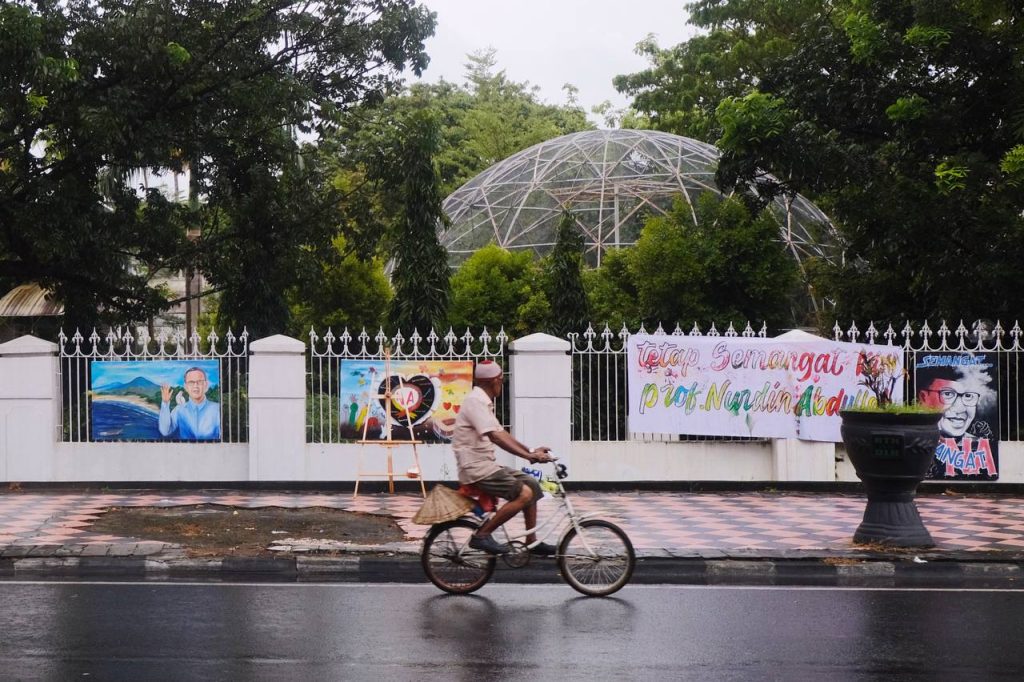 Ubin yang licin dan gerimis hujan di sore hari tak mematahkan niat mereka untuk tetap melukis. Sebagian besar lukisannya bergambarkan wajah Prof. Nurdin Abdullah dengan tulisan ‘Semangat, Pak. Kami terus mendoakan’.
