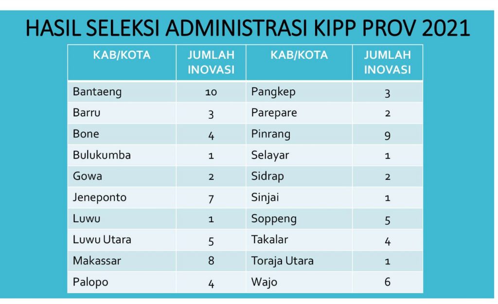 Bantaeng adalah daerah terbanyak meloloskan inovasinya di tahap ini dengan 10 inovasi. Disusul Pinrang (9), Makassar (8), Jeneponto (7), Wajo (6), baru kemudian Luwu Utara (5). Total inovasi pelayanan publik yang lolos seleksi administrasi sebanyak 87, terdiri dari 8 inovasi Perangkat Daerah (PD) Tingkat Provinsi, dan 79 inovasi dari 20 PD Tingkat Kabupaten/Kota.