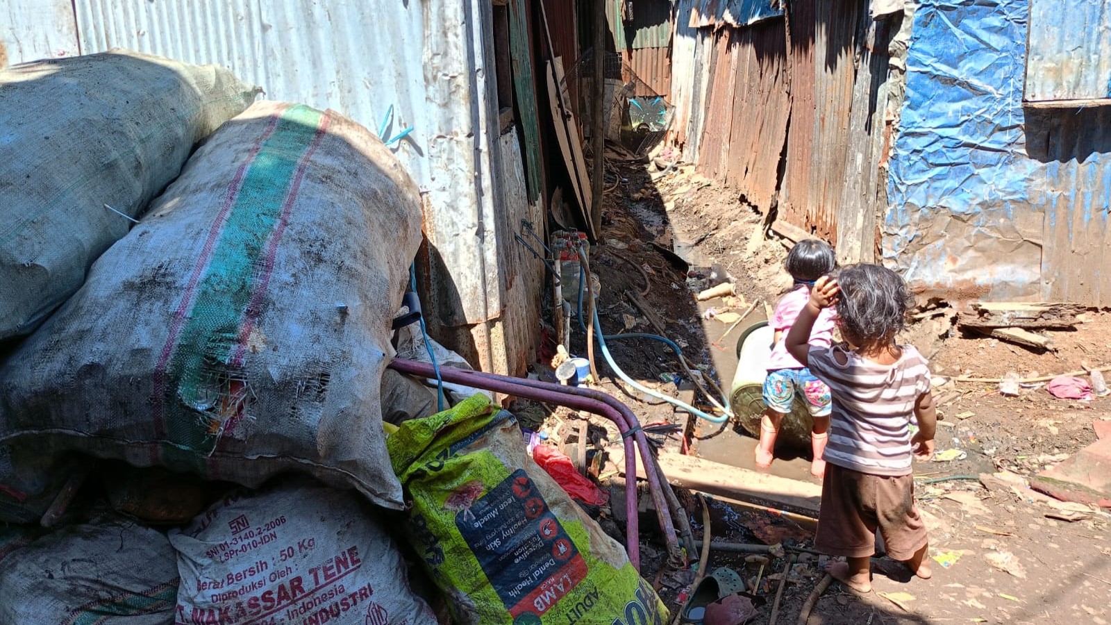 Saat memasuki lorong pemukiman warga yang mayoritasnya pemulung itu, terlihat dua anak perempuan sekitar usai 1 tahun bermain air dalam wadah baskom yang berasal dari pipa air PDAM. Salah satu anak menumpahkan air ke lantai yang searah dengan saluran tempat pembuangan. Satunya lagi meminum sisa air dalam baskom.