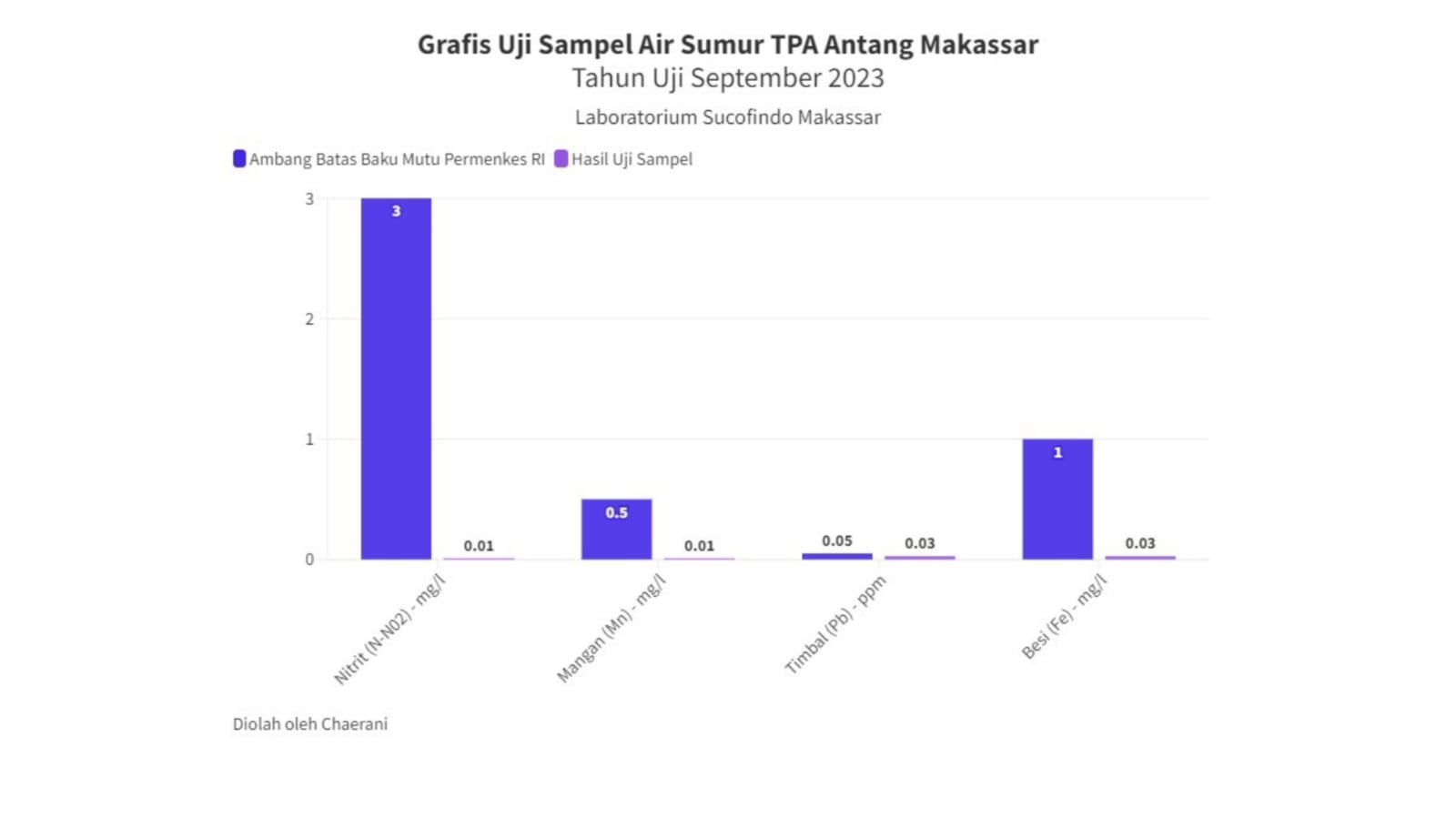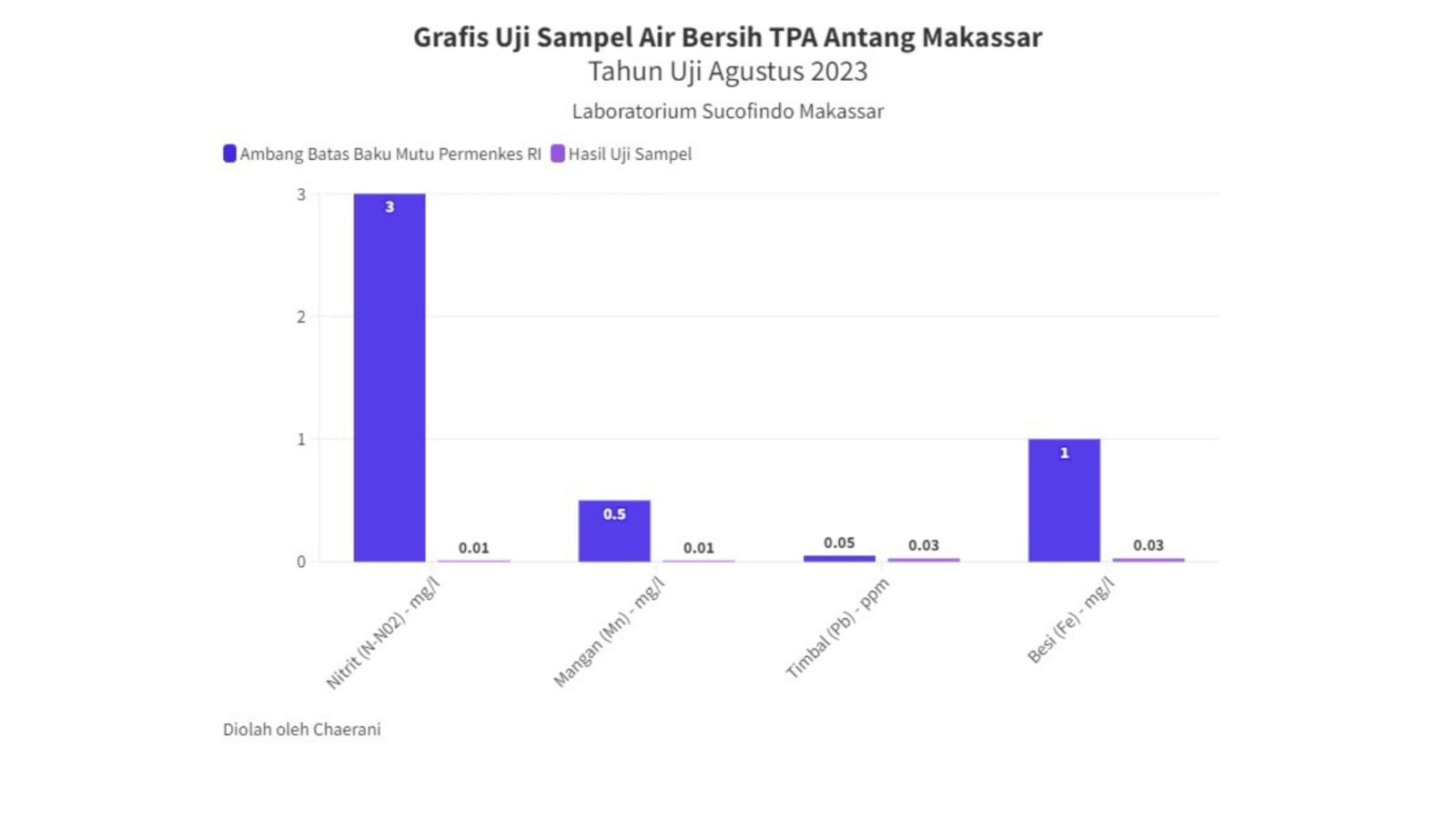 Selanjutnya untuk memastikan penelitian keduanya, penulis turut melakukan pengujian sampel air melalui Air Bersih PDAM Makassar yang berlokasi di perumahan pemulung milik Sinar yang berada di Jalan AMD Borong Jambu, RT 3, RW 4 atau TPA Lama. Hasilnya terdapat kontaminasi logam berat pada paramater Timbal (Pb) sebesar 0,027 ppm atau berada dibawah ambang batas Permenkes sebesar 0,05 ppm. Begitupun pada hasil pengujian parameter Besi (Fe) dengan hasil 0,027 mg/L atau berada dibawah ambang batas Permenkes sebesar 1mg/L.
