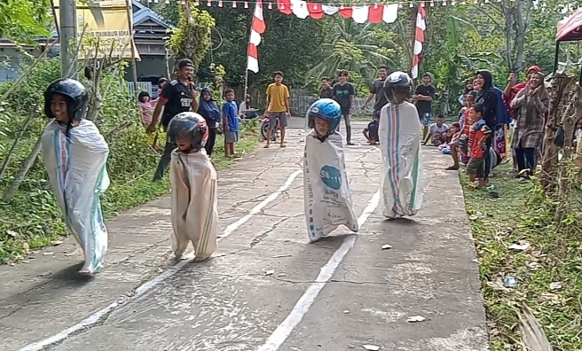 Saat kegiatan lomba balap karung menggunakan helm yang diikuti peserta anak-anak berlangsung, mereka terlihat gembira dan tertawa sambil berusaha menjadi nomor satu pada lomba tersebut. Selain itu, teriakan dan sorakan penonton mewarnai keseruan lomba tersebut dan peserta terlihat gembira dan tertawa.