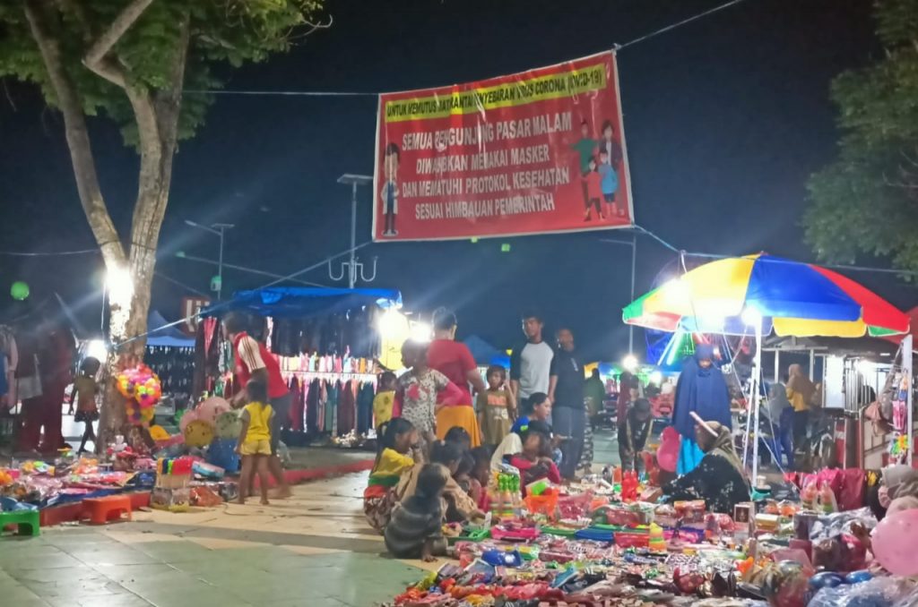 Suasana Pasar Malam di Taman Matana Sorumba, Kecamatan Mawasangka, Kabupaten Buton Tengah, Kamis (31/12/2020) malam. Warga berkerumun dan tidak memakai masker.