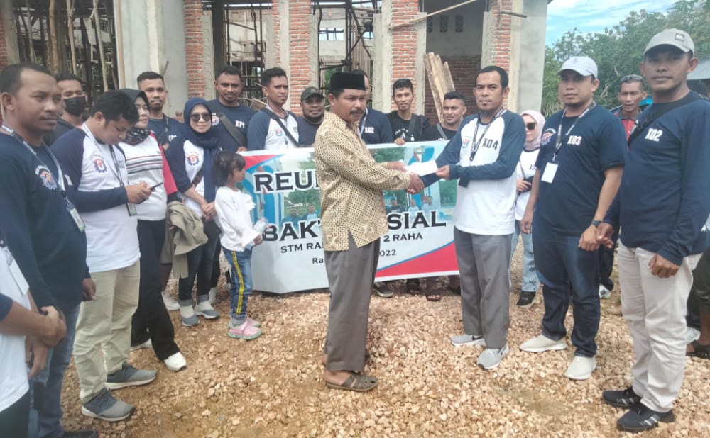 Kata Ketua Panitia Reuni STM Raha, Asrullah menyerahkan bantuan mengatakan, dana yang diberikan ke panitia pembangunan Masjid berasal dari sejumlah alumni angkatan.