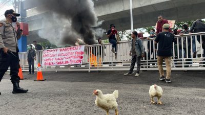 Massa dari ProDEM, saat melakukan aksi di bawah teriknya matahari turut membawa dua ekor ayam potong sebagai simbol keresahan publik dengan pelayanan kepolisian. (*)