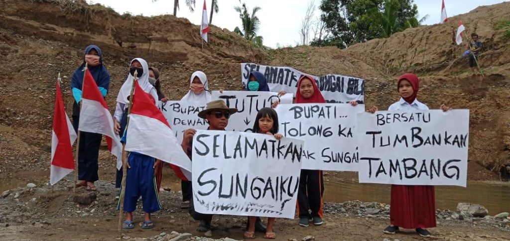 Selain dari pengibaran bendera masyarakat juga membentangkan spanduk yang bertuliskan “Selamatkan Sungai Bila” dan berbagai jenis spanduk penolakan tambang yang di pegang oleh anak-anak sekolah.