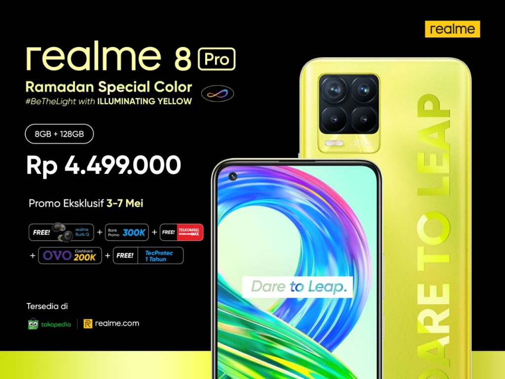 Selain itu, terkait harga anak muda bisa mendapatkan warna spesial Ramadan realme 8 Pro Illuminating Yellow 8GB+128GB dengan harga Rp 4,499,000 eksklusif hanya di Tokopedia mulai 3 Mei hingga 7 Mei dengan gratis realme Buds Q, gratis bundling Telkomsel Max, gratis Tec Protec 1 tahun, cashback OVO Points senilai Rp 200,000 per pengguna dan diskon Rp 300,000 dari mitra bank. (Asm)