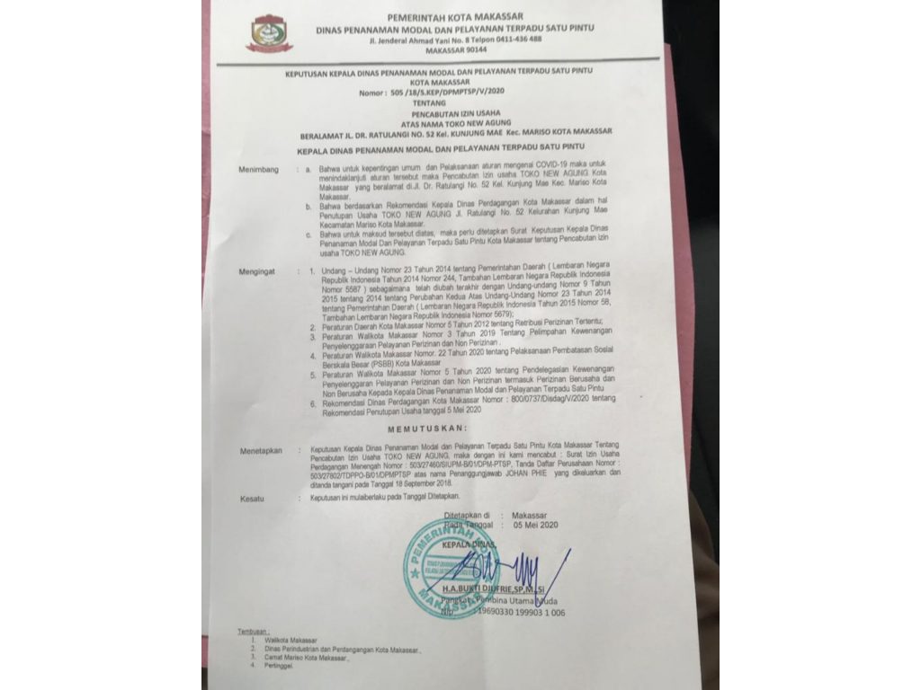 REPUBLIKNEWS.CO.ID, MAKASSAR — Pemerintah Kota Makassar melalui Dinas Penanaman Modal dan Pelayanan Terpadu Satu Pintu (DPM-DPTSP), resmi mencabut izin usaha toko alat tulis (Toko New Agung) yang terletak di Jln Ratulangi, pada Selasa (05/05/2020) kemarin.