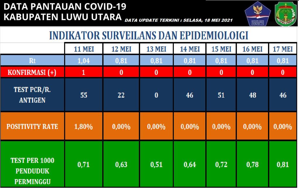 Sementara Data Indikator Surveilans dan Epidemiologi terbaru, 17 Mei 2021, yang dikeluarkan Satgas COVID-19 Luwu Utara bahwa angka reproduksi efektif (Rt) COVID-19 di Luwu Utara adalah 0,81, dengan jumlah test PCR 46 kali per hari. Angka positivity rate 0,00%, dengan jumlah test PCR/Antigen per 1.000 penduduk per minggu adalah 0,81. Angka 0,81 ini menggambarkan bahwa Luwu Utara kini dalam penanganan COVID-19 yang benar, karena sudah mendekati standar WHO, yakni 1/1.000 dari jumlah penduduk yang ada. (*)