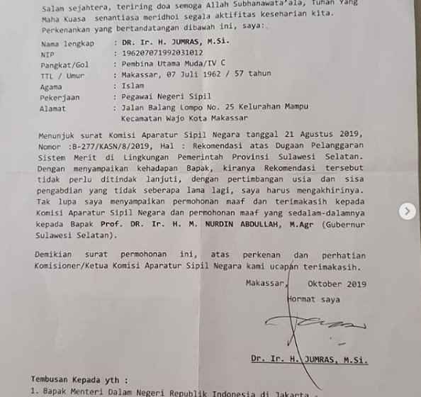 REPUBLIKNEWS.CO.ID, MAKASSAR — Mantan Kepala Biro Pembangunan Sulsel Dr. Ir. H Jumras, M.Si menyampaikan permohonan maaf kepada Gubernur Sulsel Prof. Nurdin Abdullah, melalui surat resmi yang diterima wartawan, Rabu (13/11/2019).