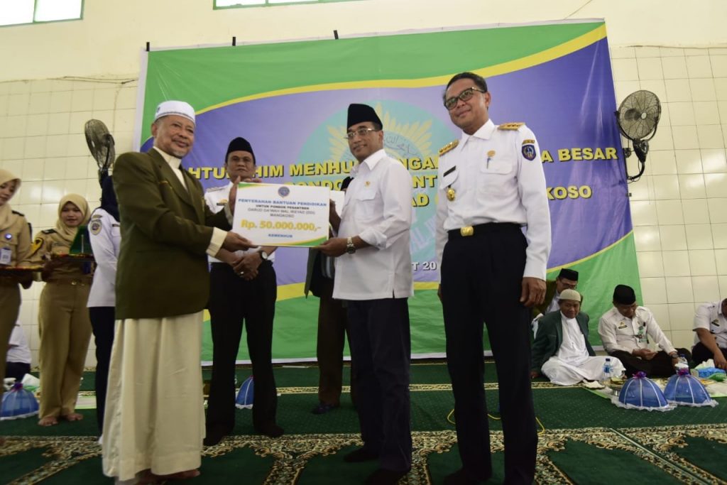 Sementara itu, Menhub pada kesempatan ini menyerahkan bantuan pendidikan Rp 50 juta dan bantuan pembangunan pesantren semen sebanyak 100 sak.