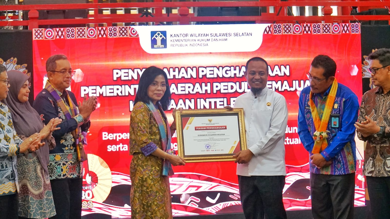 REPUBLIKNEWS.CO.ID, MAKASSAR — Menteri Hukum dan HAM RI, Yasonna H. Laoly melalui Direktorat Jendral Kekayaan Intelektual Min Usihen memberikan penghargaan kepada Gubernur Provinsi Sulawesi Selatan Andi Sudirman Sulaiman.