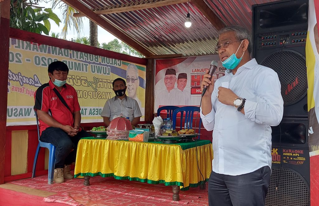 Calon Bupati Luwu Timur Nomor Urut 1 Torig Husler, memberikan sambutan di hadapan warga Dusun Tabarano, Kecamatan Wasuponda, Kamis (01/10/2020).
