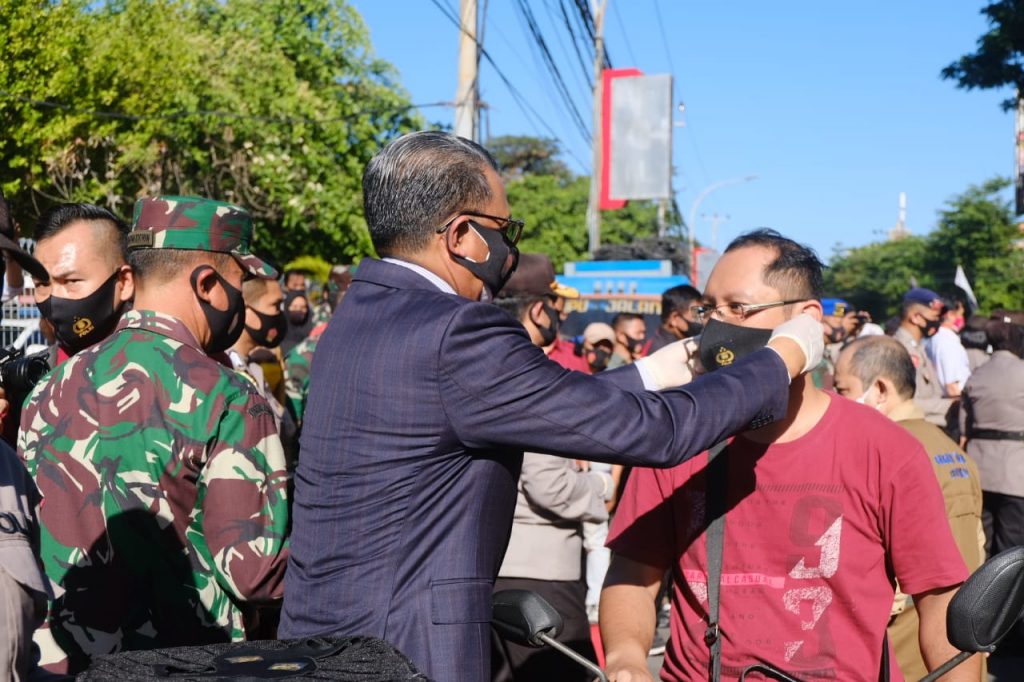 Gubernur Sulsel Prof. Nurdin Abdullah, memakaikan masker secara simbolis kepada salah satu pengguna jalan di Depan Karebosi, Jl. Ahmad Yani Makassar, Kamis (10/09/2020).