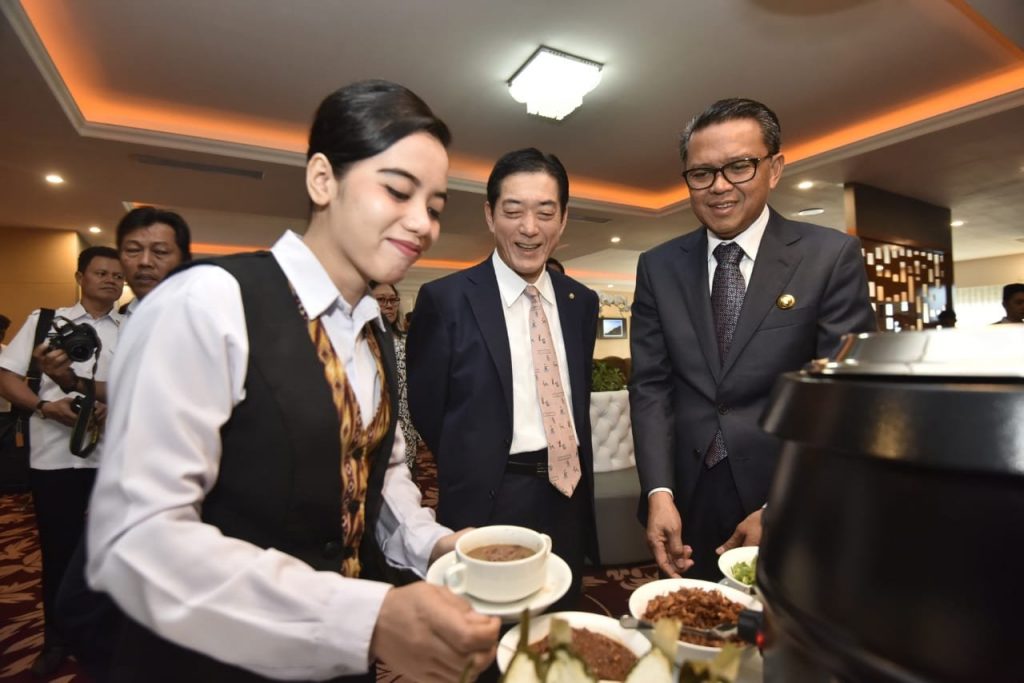 Nurdin membawa Tokihiro Nakamura meninjau satu per satu sudut lounge. Nurdin Abdullah menjelaskan salah satu fungsi adalah untuk memudahkan masyarakat dalam memperoleh informasi.
