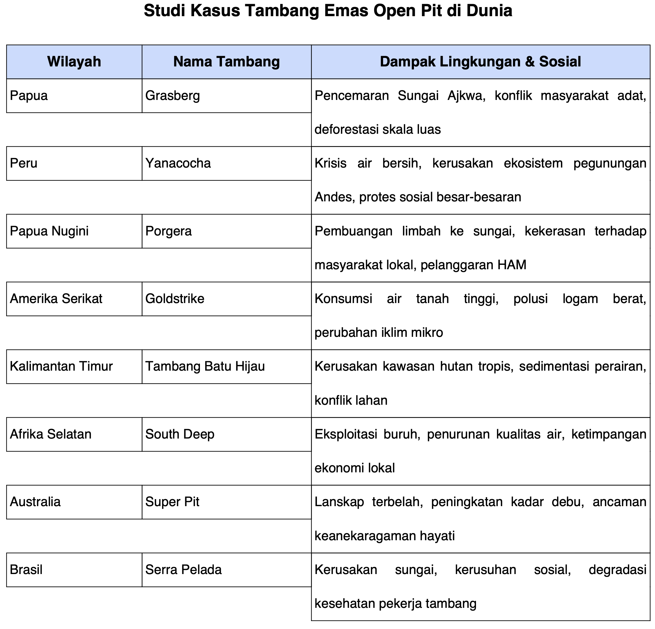 Studi-studi ilmiah menunjukkan bahwa tambang open pit memiliki dampak jangka panjang yang serius, baik terhadap lingkungan maupun sosial masyarakat.
