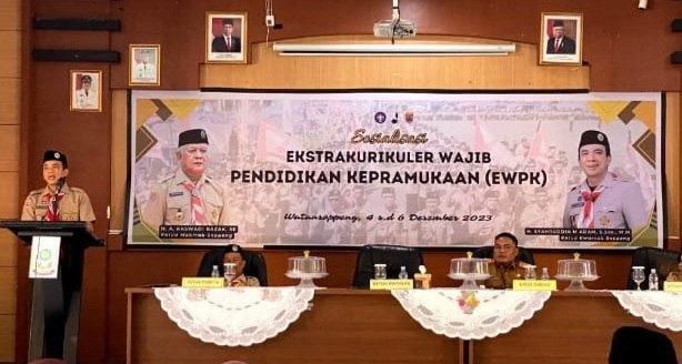 REPUBLIKNEWS.CO.ID, SOPPENG — Ketua Kwarcab Soppeng Syahruddin M Adam, membuka orientasi sosialisasi Ekstrakurikuler wajib Pendidikan Kepramukaan di Aula Dinas Pendidikan dan Kebudayaan Kabupaten Soppeng, Senin (04/12/2023).