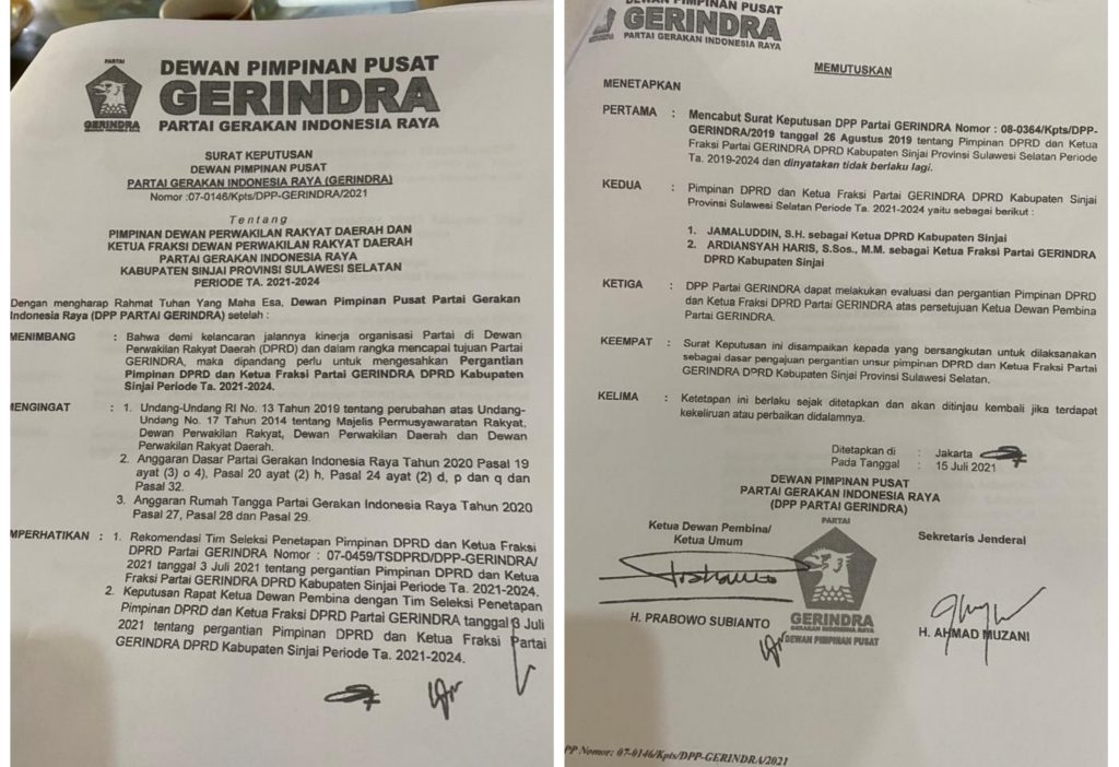 Dalam keputusannya, mencabut SK DPP Gerindra Nomor 08-364/Kpts/DPP-Gerindra/2019 tanggal 26 Agustus 2019 tentang Pimpinan dan Ketua Fraksi DPRD Kabupaten Sinjai Provinsi Sulawesi Selatan Periode tahun anggaran 2019-2024 yang dinyatakan tidak berlaku lagi.