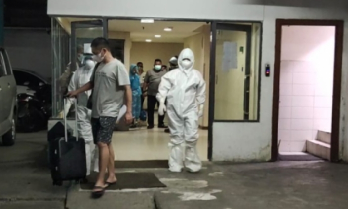 Dalam beberapa foto yang tersebar di grup WhatsApp, terlihat sejumlah petugas dari kelurahan dan Satgas Covid-19 setempat dibantu petugas Kepolisian tengah melakukan upaya penjemputan di salah satu koridor apartemen.
