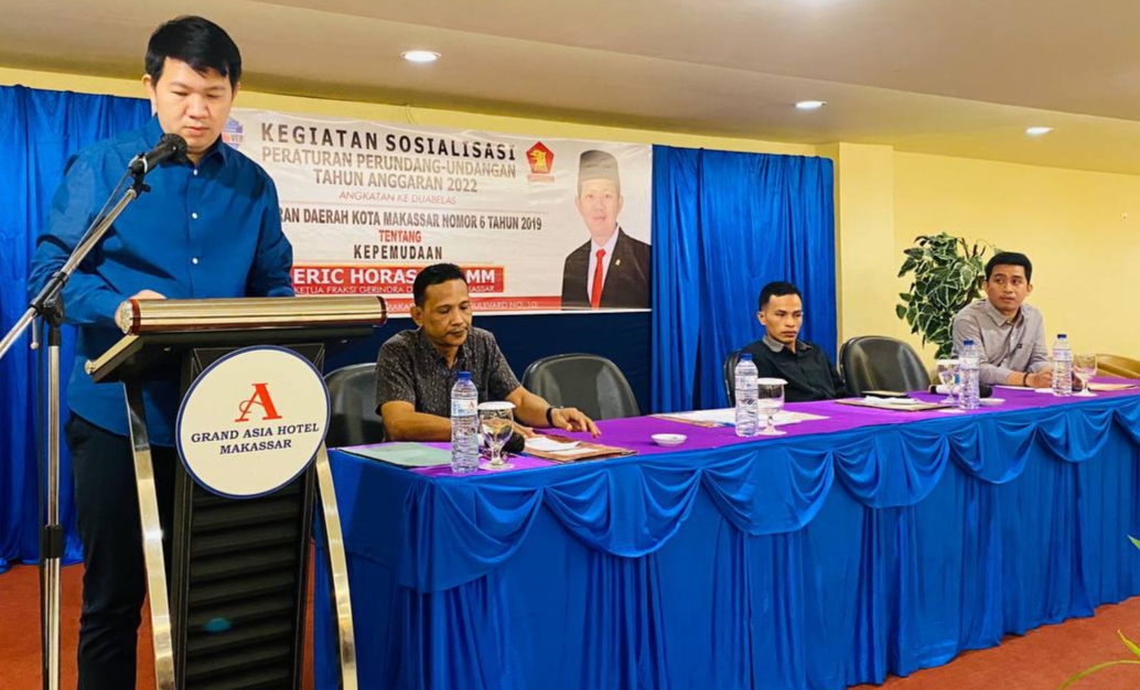 Hal tersebut disadari betul oleh Anggota DPRD Kota Makassar, Eric Horas. Sebagai wujud nyata kepeduliannya terhadap pemuda, ketua Fraksi Partai Gerindra DPRD Kota Makassar itu menggelar sosialisasi Peraturan Daerah (Perda) Kota Makassar Nomor 6 Tahun 2019 tentang Kepemudaan.